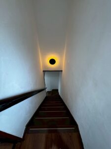 おしゃれで月食の様な形の階段ブラケット照明は、工事中に私が階段を昇降する時に地中海の建物イメージが浮かび、ソウケンさんよりプレゼントで設置させて頂きました。