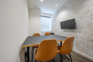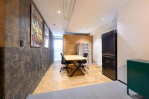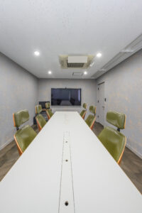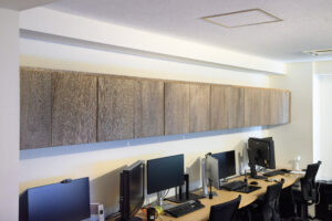 会議室の壁材は「OSB」という、木質チップを押し固めた建材に「不燃認定品」を使用しました。